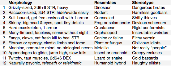 Follow standard Into the Odd rules to create a human, or roll on table to make a species. (In case it’s not clear, the “stereotype” column is very much meant to represent offensive views held by outsiders. The entry for earthlings would probably be “arrogant newcomers” or “kids with grenades” in the settings I’d be likely to run.)